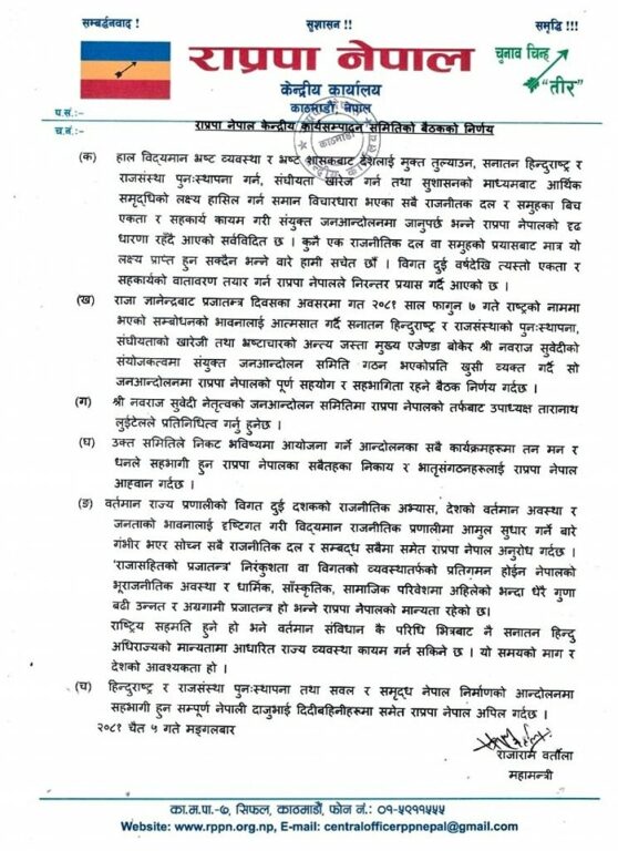 ‘…सनातन हिन्दू राष्ट्र र राजसंस्थाको पुनःस्थापना, संघीयता खारेजी तथा भ्रष्टाचार अन्त्य जस्ता मुख्य एजेण्डा बोकेर श्री नवराज सुवेदीको संयोजकत्वमा संयुक्त जनआन्दोलन समिति गठन भएकोप्रति खुसी व्यक्त गर्दैै सो जनआन्दोलनमा राप्रपा नेपालको पूर्ण सहयोग र सहभागिता रहने बैठक निर्णय गर्दछ,’ कार्यसम्पादन समितिको बैठकपछि जारी विज्ञप्तिमा भनिएको छ ।