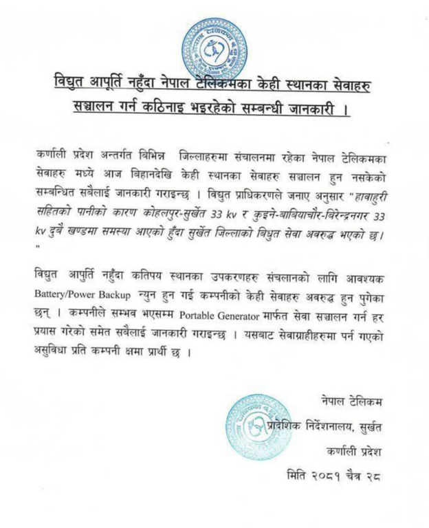 विद्युत् आपूर्ति अवरुद्ध हुँदा केही स्थानका उपकरणहरू सञ्चालन गर्न आवश्यक Battery/Power Backup न्यून हुँदा सेवामा समस्या देखिएको कम्पनीले जानकारी दिएको छ । टेलिकमले Portable Generator प्रयोग गरेर सेवा निरन्तर राख्ने प्रयास गरिरहेको जनाएको छ । कम्पनीले असुविधाका लागि ग्राहकहरूप्रति क्षमायाचनासमेत गरेको छ।