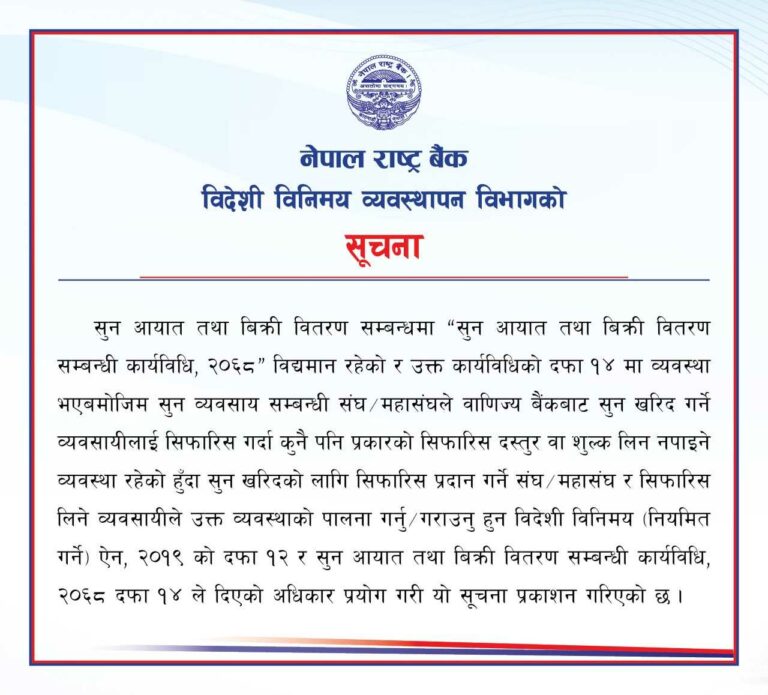 राष्ट्र बैंकले जारी गरेको सूचनामा भनिएको छ, ‘सुन आयात तथा बिक्री वितरण सम्बन्धमा ‘सुन आयात तथा बिक्री वितरण सम्बन्धी कार्यविधि, २०६८’ विद्यमान रहेको र उक्त कार्यविधिको दफा १४ मा व्यवस्था भएबमोजिम सुन व्यवसाय सम्बन्धी संघ र महासंघले वाणिज्य बैंकबाट सुन खरिद गर्ने व्यवसायीलाई सिफारिस गर्दा कुनै पनि प्रकारको सिफारिस दस्तुर वा शुल्क लिन नपाइने व्यवस्था रहेको हुँदा सुन खरिदको लागि सिफारिस प्रदान गर्ने संघ, महासंघ र सिफारिस लिने व्यवसायीले उक्त व्यवस्थाको पालना गर्नु ।’