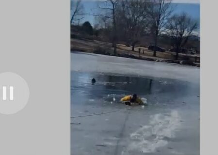 बर्फले जमेको झीलमा फसेको कुकुरलाई फायर फाइटरले यसरी निकाले (भिडियो)