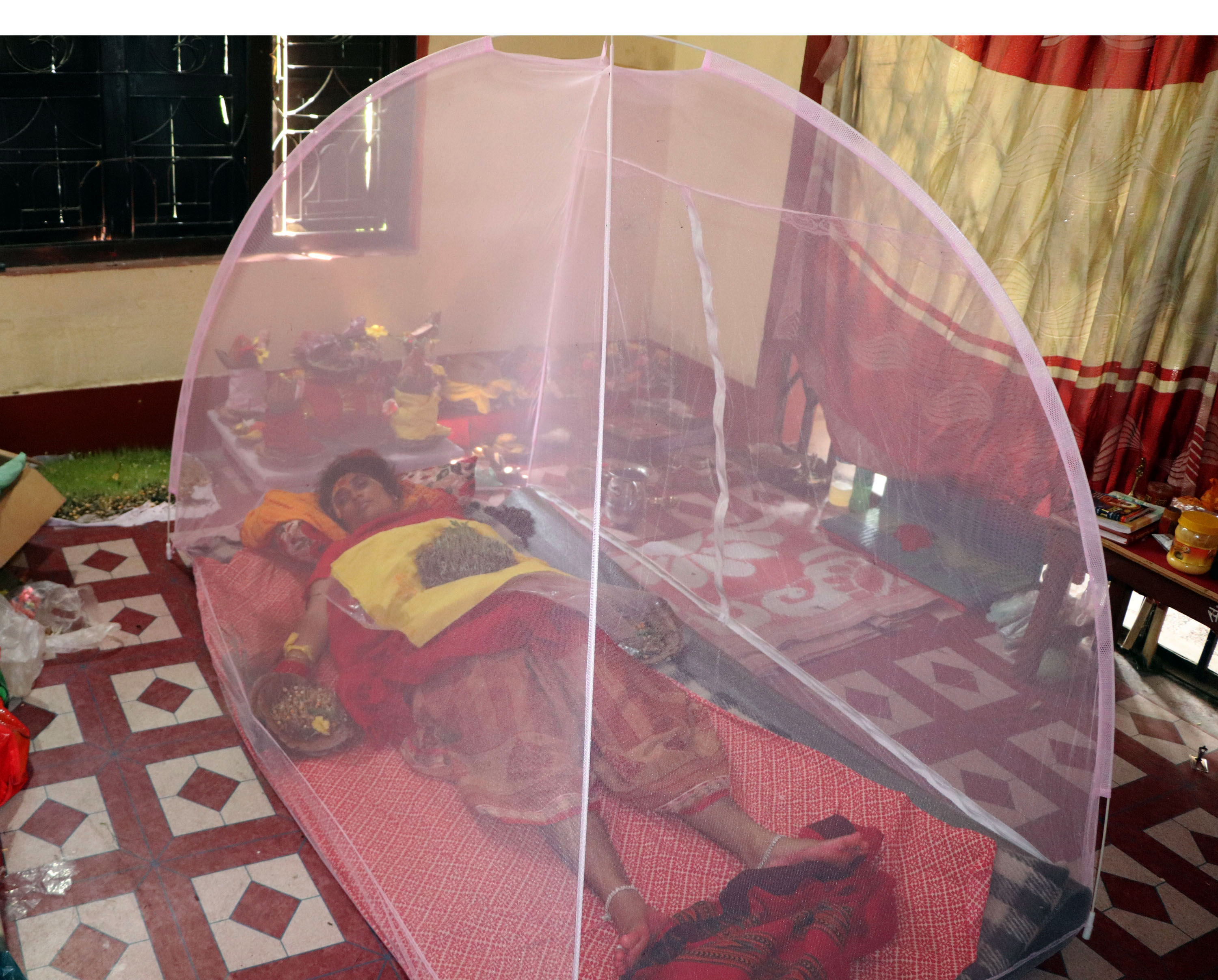 दुइ हात र छातीमा जमारा उमार्दै एक महिला, राष्ट्र शान्तिका लागि निराहार व्रत