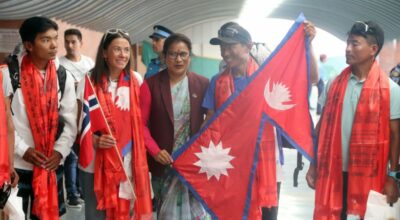विश्वकीर्तिमानी पर्वतारोही हरिला र शेर्पालाई विमानस्थलमा भव्य स्वागत