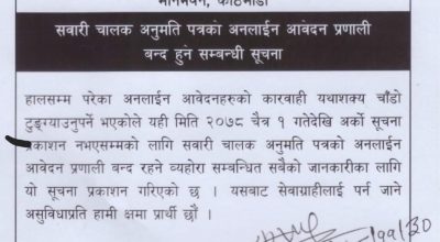 सवारी चालक अनुमतिपत्रको अनलाइन आवेदन प्रणाली बन्द