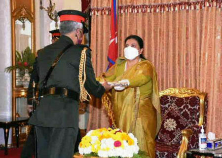 राष्ट्रपतिद्वारा भारतीय सेनाध्यक्षलाई नेपाली सेनाको मानार्थ महारथी दर्जा प्रदान