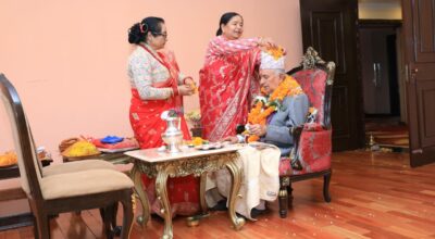 शुभसाईतमा राष्ट्रपति पौडेलले बहिनीहरूबाट लगाए टीका