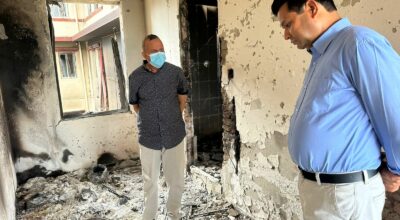 खण्डहर बनेको पार्टी कार्यालय अनुगमनका लागि पुगे एमाले महासचिव पोखरेल