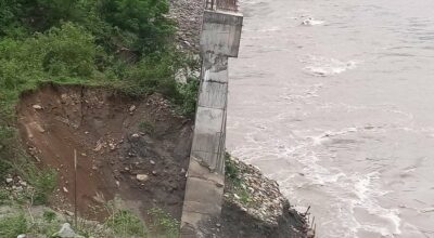 धाप्लाङघाटमा निर्माणाधीन पक्की पुलको खम्बा बाङ्गियो