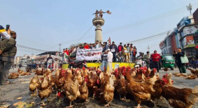 उचित मूल्य नपाएपछि झापामा किसानहरुले गरे कुखुरा र अण्डा सडकमा फालेर प्रदर्शन