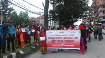 फुटपाथमा व्यापार गर्न पाउनुपर्ने माग गर्दै व्यापारीको प्रदर्शन (फोटो फिचर)
