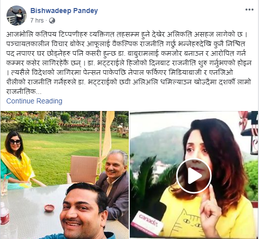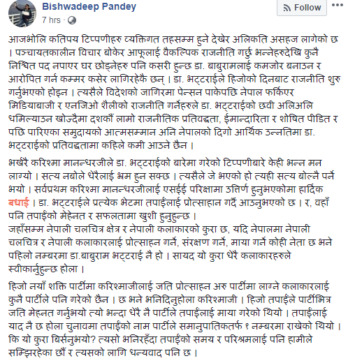 पाण्डेले फेसबुकमा स्टाटस पोष्ट गर्दै डा. बाबुराम भट्टराईप्रति करिश्माले गरेको टिप्पणीलाई पद नपाउँदाको आक्रोश भएको बताए ।