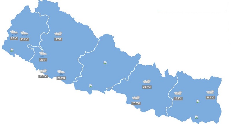 राती: देशका अधिकांश भू-भागमा सामान्य देखि पूर्ण बदली रहनेछ। देशका धेरै भू-भागमा वर्षाको सम्भावना छ। देशको थोरै स्थानहरुमा भारि वर्षाको संभावना छ ।