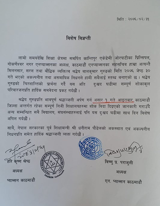 प्याब्सनले एक सूचना जारी गर्दै आइतबार काठमाडौँका सम्पूर्ण निजी विद्यालय बिदा दिने निर्णय गरेको हो । बौद्धमा अवस्थित कान्तिपुर एकेडेमी हाईस्कुलका प्रिन्सिपल बालुकुमार गुरुङको निधनका कारण प्याब्सनले असार १ गते विधालयहरुमा बिदा दिने निर्णय गरेको हो ।