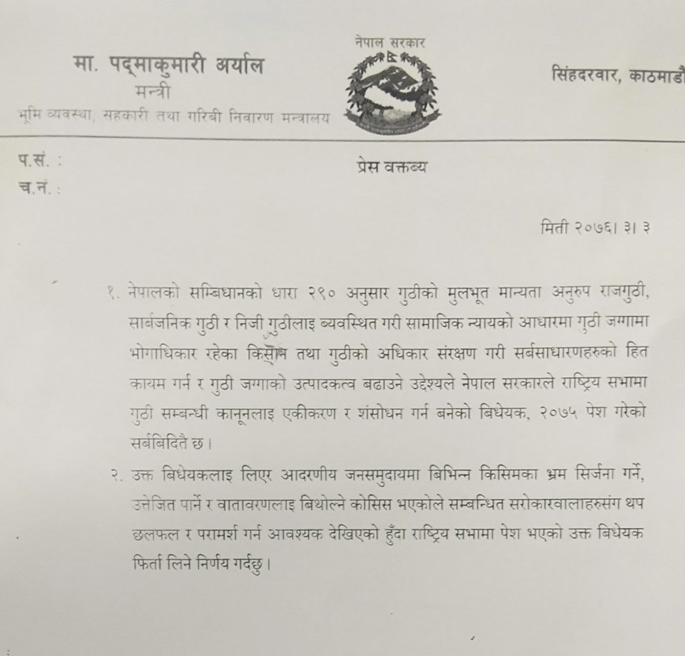 भूमि व्यवस्था मन्त्री पद्मा अर्यालले पत्रकार सम्मेलन गरेर यो जानकारी दिएकी हुन् ।