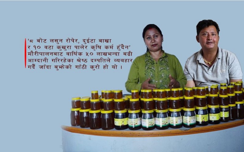 काठमाडौं ।‘८ बोट लसुन रोपेर, दुईटा बाख्रा र १० वटा कुखुरा पालेर कृषि कर्म हुँदैन’ मौरीपालनबाट वार्षिक ५० लाखभन्दा बढी आम्दानी गरिरहेका श्रेष्ठ दम्पतिले व्यवहार गर्दै जाँदा बुझेको गाँठी कुरो हो यो ।