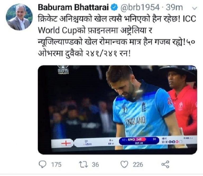 लण्डनमा आइतबार भएको फाइनलमा न्युजिल्याण्डलाई सुपर ओभरमा पराजित गर्दै इंग्ल्याण्डले उपाधि हात पारेसँगै डा. बाबूराम भट्टराईले आफ्नो टुईटर अकाउन्ट मार्फत टुईट गरे “क्रिकेट अनिश्चयको खेल त्यसै भनेको होइन रहेछ फाइनलमा अस्ट्रेलिया र न्युजिल्यान्डको खेल रोमान्चक मात्र होइन गज्जब रह्यो”