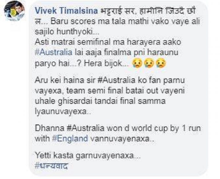 हतारमा उनले सेमिफाईनलमा आउट भएको अस्ट्रेलियाको नाम फाईनलमा लिएका थिए । त्यस पछि उनलाई सामाजिक संजालमा नहत्तारीनु भन्नेको ओइरो लागेको छ ।