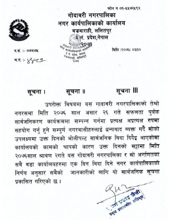 हरेक वर्ष नीति तथा कार्यक्रम सार्वजनिक गरेको भोलीपल्ट कार्यक्रम सम्पन्न गर्नमा प्रत्यक्ष, अप्रत्यक्ष रुपमा सहयोग गर्ने सम्पूर्ण नगरवासीलाई धन्यवाद दिदै सो को सार्वजनिक विदा दिने विज्ञप्तिमा उल्लेख गरिएको छ ।