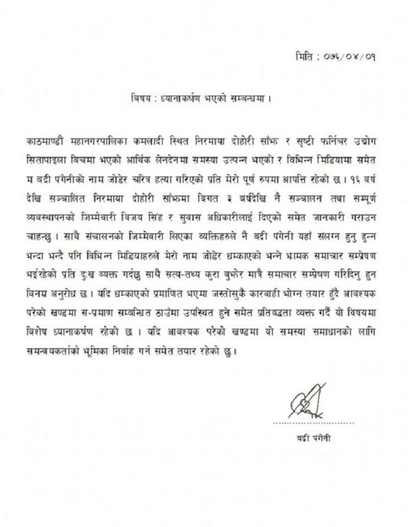आपसी कारोबारलाई लिखित सहमतिको आधारमा टुंगोमा पु-याउनुको साटो सस्तो लोकप्रियताको लागि मेरो नामको जुन दुरुपयोग भएको छ त्यस प्रति म घोर आपत्ति जनाउँदछु’ पंगेनीले भनेका छन् ।
