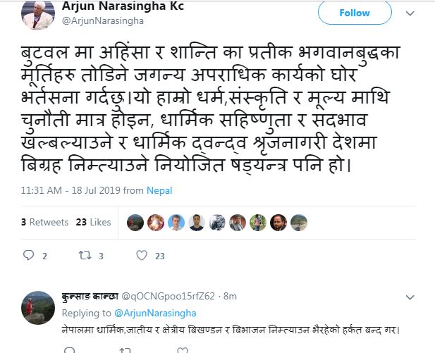 बुद्धको मूर्ति तोडफोड प्रकरण : कांग्रेस नेता अर्जुननरसिंह केसीको यस्तो ट्वीट