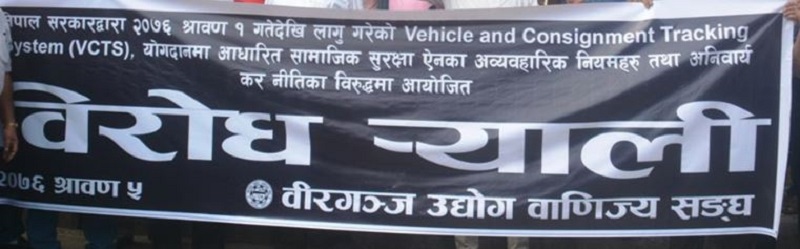 उद्योगी व्यवसायीहरुले विरोध जुलुश निकालेकेर प्रदर्शन गरेका हुन् । वीर्तास्थित उद्योग वाणिज्य संघको परिसरबाट हातमा कालोपट्टी बाँधेर निस्किएका उद्योग व्यावसायी सहभागी जुलुस अलखियामठ, आदर्शनगरहुँदै वीरगन्जको मुख्य चोक घण्टाघरमा पुगेर कोणससभामा परिणत भएको थियो ।