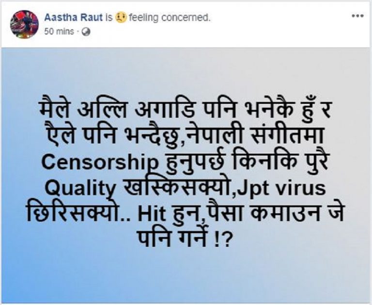 यस्तै गायिका राउतले बुधबार विहान मात्रै पनि एउटा अर्काे स्टाटस् फेसबुकमा लेख्नुभएको छ ।