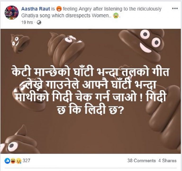 यो गीतमा दि भ्वाईस अफ नेपालकी कोच आस्था राउतको आक्रोस झनै बढि छ । उहाँ लेख्नुहुन्छ । केटी मान्छेको घाँटी भन्दा तलको गीत लेख्ने गाउनेले आफ्नै घाँटी भन्दा माथीको गिदी चेक गर्न जाओ ! गिदी छ कि लिदी छ?