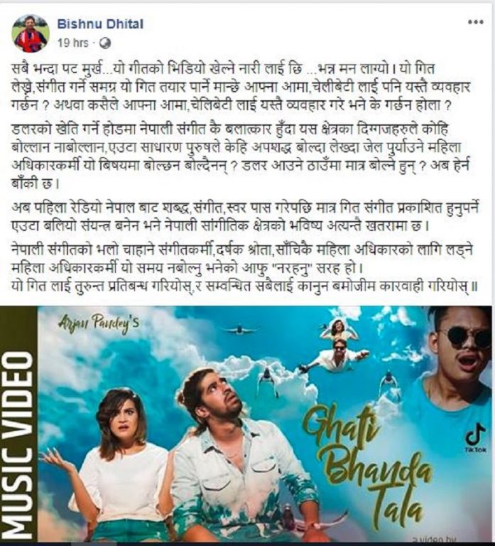 यसैगरी विष्णु धितालले फेसबुकमा लेख्नु भएको छ । सबै भन्दा पट मुर्ख…यो गीतको भिडियो खेल्ने नारी लाई छि……भन्न मन लाग्यो । यो गित लेख्ने, संगीत गर्ने समग्र यो गित तयार पार्ने मान्छे आफ्ना आमा, चेलीबेटीलाई पनि यस्तै व्यवहार गर्छन ? अथवा कसैले आफ्ना आमा, चेलिबेटी लाई यस्तै व्यवहार गरे भने के गर्छन होला ? भन्दै प्रश्न गर्नुभएको छ ।