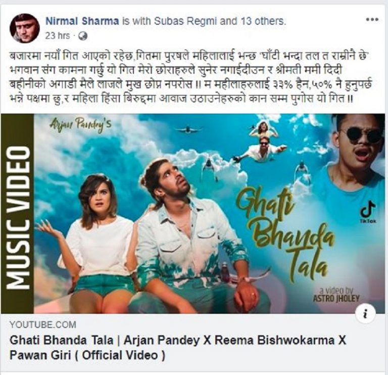 अभिनेता निर्मल शर्माले गीतको आलोचना गर्दै फेसबुक स्टाटस नै लेख्नुभएको छ । बजारमा नयाँ गीत आएको रहेछ । गीतमा पुरुषले महिलालाई भन्छ ‘घाँटी भन्दा तल त राम्री नै छे’ भगवानसँग कामना गर्छु यो गीत मेरो छोराहरुले सुनेर नगाइदिउन् र श्रीमती, ममी, दिदीबहिनीको अगाडी मैले लाजले मुख छोप्न नपरोस । म महिलाहरुलाई ३३ प्रतिशत हैन ५० प्रतिशत नै हुनुपर्छ भन्ने पक्षमा छु । र, महिला हिंसाविरुद्धमा आवाज उठाउनेहरुको कानसम्म पुगोस यो गीत ।”