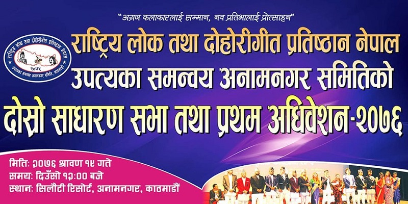 काठमाण्डौं । राष्ट्रिय लोक तथा दोहोरी गीत प्रतिष्ठान नेपाल, उपत्यका समन्वय समिति, अनामनगरको दोस्रो साधारण सभा तथा प्रथम अधिवेशन – २०७६ आईतबार हुँदैछ ।
