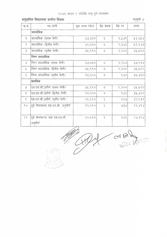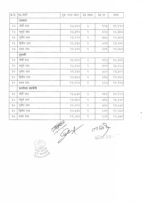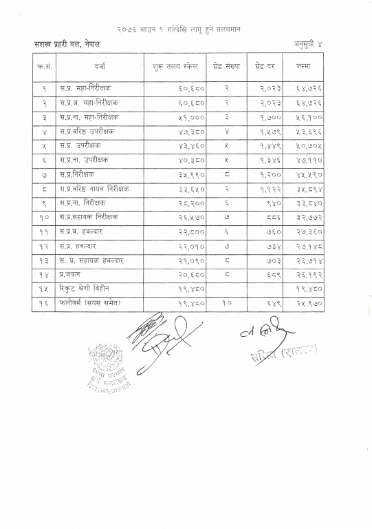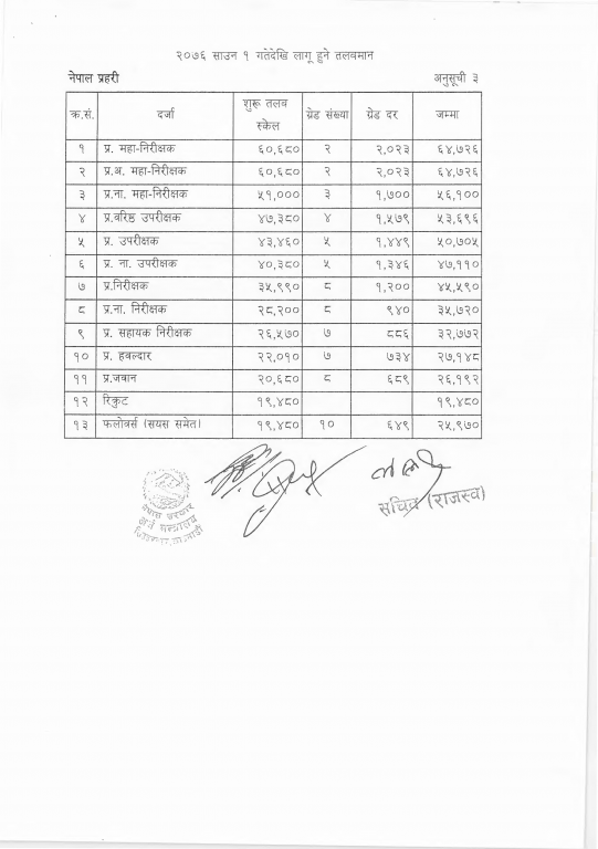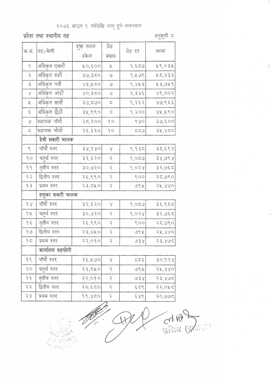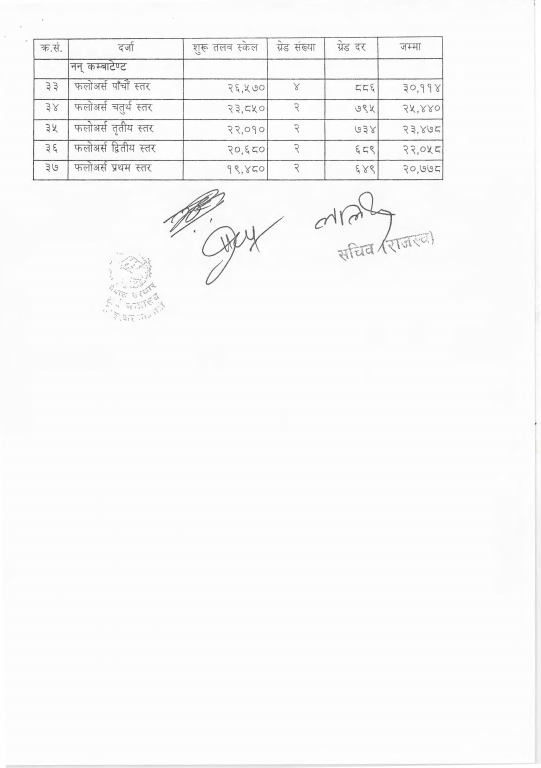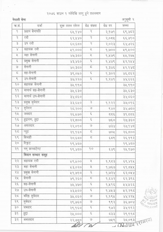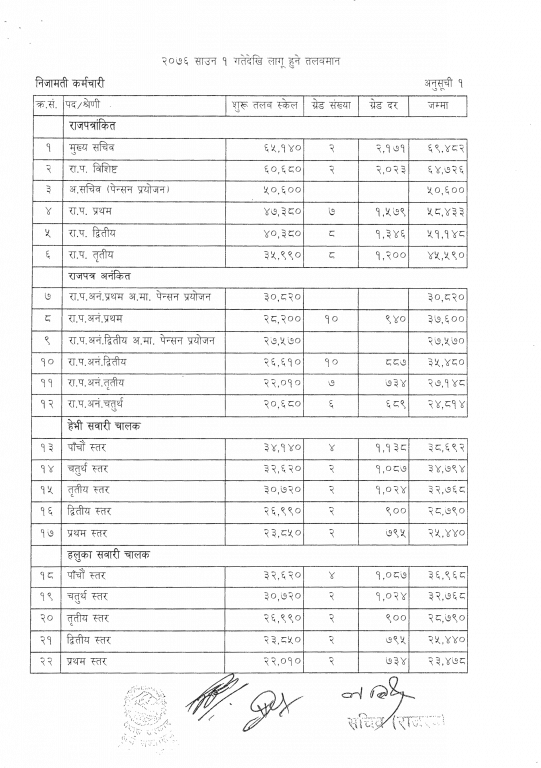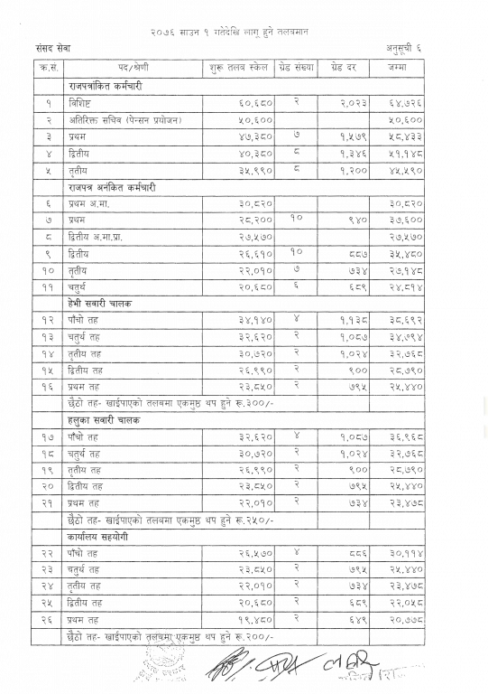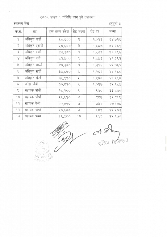 काठमाडौं । चालु आर्थिक वर्ष २०७६/७७ देखि लागू हुने गरी बढेको सरकारी कर्मचारीहरुको तलबमान सार्वजनिक भएको छ ।