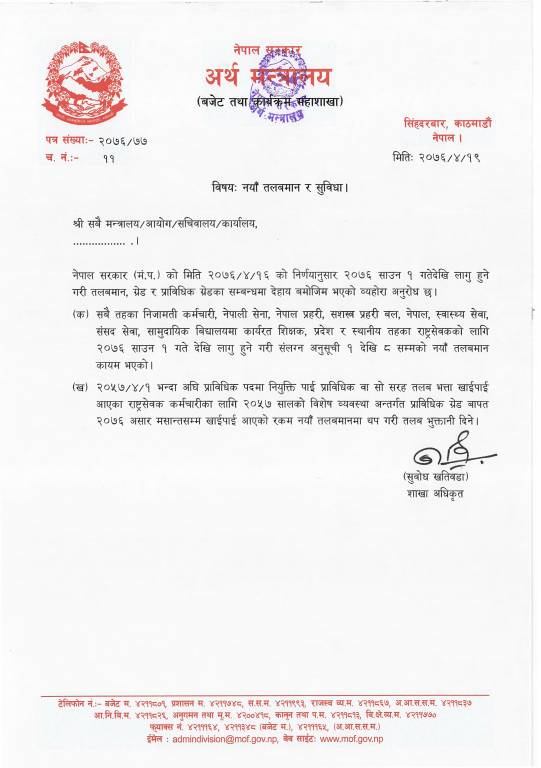 अर्थ मन्त्रालयको बजेट तथा कार्यक्रम महाशाखाले आइतवार सूचना प्रकाशित गर्दै तलबमान सार्वजनिक गरेको छ ।