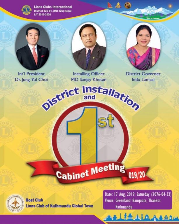 काठमाडौं- लायन्स क्लव ईन्टरनेशनल ३२५ बि १ को पहिलो डिस्ट्रिक्ट ईन्सटलेशन तथा यस वर्षको प्रथम क्याविनेट मिटिङ आगामी अगष्ट १७ अर्थात साउन ३२ गते शनिबार हुने भएको छ । ग्रिनल्याण्ड ब्याङ्क्वेट, थानकोट, काठमाडौंमा हुने १०२ औँ अन्तर्राष्ट्रिय कन्भेन्सनमा एकैपटक ८४ वटा नयाँ क्लब खोलेर संसारकै नम्बर १ हुन सफल लायन ईन्दु लम्सालद्वारा नेतृत्व गरिएको डिस्ट्रिक्टको प्रथम क्याविनेट मिटिङलाई बिशेष महत्वका साथ हेरिन्छ। यो बैठकमा १०० भन्दा धेरै नयाँ क्लवको समुद्घाटन गरिने र नयाँ क्लवका सबै संस्थापक अध्यक्षहरुलाई सम्मान गरिने कार्यक्रम रहेकोछ। विश्व भरी लायन्स क्लवलाई मानवीय सेवा र सामाजिक क्रियाकलापका निम्ति अब्वल मानिन्छ।
