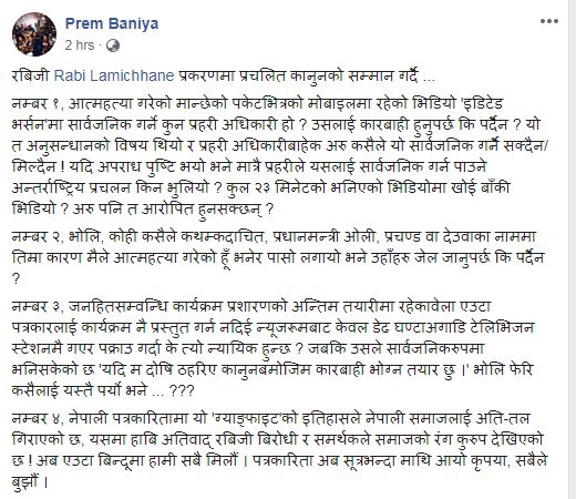 पत्रकार प्रेम बानियाँले रवि लामिछाने पक्राउ प्रकरणमा आफ्नो धारणा सार्वजनिक गर्नुभएको छ । रवी लामिछाने पक्राउ परेपछि सामाजिक सञ्जाल फेसबुकमा स्टाटस राख्दै ४ प्रश्न उठान गर्नुभएको छ ।