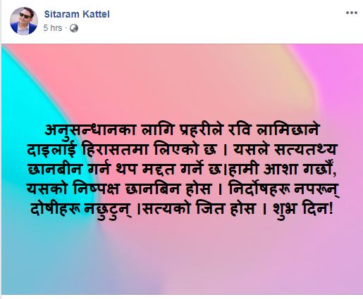 अनुसन्धानका लागि प्रहरीले रवि लामिछाने दाइलाई हिरासतमा लिएको छ । यसले सत्यतथ्य छानबीन गर्न थप मद्दत गर्ने छ’, कट्टेलले सामाजिक सञ्जालमा भनेका छन्, ‘हामी आशा गर्छौं, यसको निष्पक्ष छानबिन होस् । निर्दोषहरू नपरून् दोषीहरू नछुटुन् । सत्यको जित होस । शुभ दिन ’’