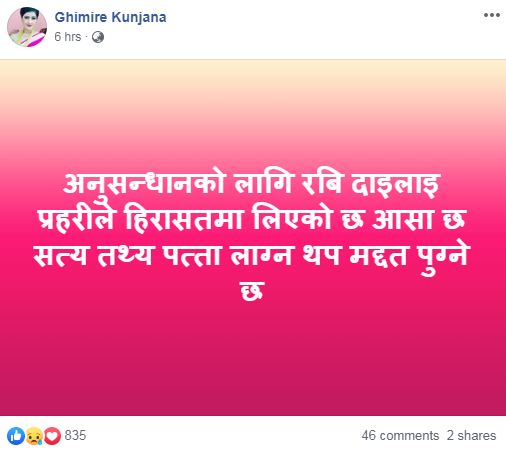 ‘’अनुसन्धानको लागि रबि दाइलाई प्रहरीले हिरासतमा लिएको छ आसा छ सत्य तथ्य पत्ता लाग्न थप मद्दत पुग्नेछ ।’’