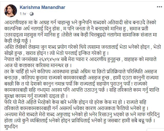 सामाजिक सञ्जालमा विरोधका आवाज उठेपछि अथवा रविका समर्थले सामाजिक सञ्जालमा गालि बर्साउन थाले पछि नायिका मानन्धरले फेरी अर्काे स्टाटस लेखकी छिन् ।
