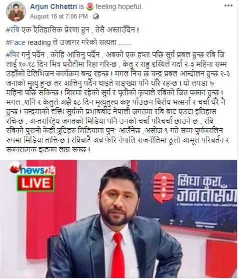 उनले लेखेका छन्, “कोहि आत्तिनु पर्दैन , अबको एक हप्तापछि सुर्य प्रबल हुन्छ रबि जिलाई १०-१८ दिन भित्र धरौटीमा रिहा गरिन्छ, केतु र राहु दृष्टिले गर्दा २-३ महिनासम्म उहाँको टेलिभिजन कार्यक्रम बन्द रहन्छ ! मंगल निच छ, चन्द्र प्रबल आन्दोलन हुन्छ २-३ जनाको मुत्यु हुन्छ तर आत्तिनु पर्दैन घाइते सङ्ख्या पनि थोरै रहन्छ !”