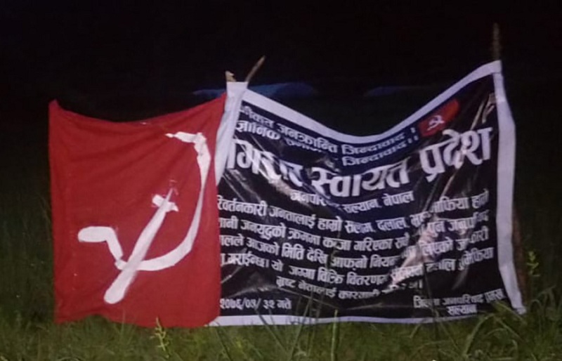 विप्लवको ‘जिल्ला जनपरिषद्’ सल्यानले जग्गामा झण्डा गाडेको छ भने कालो ब्यानरसमेत टाँगेको छ ।