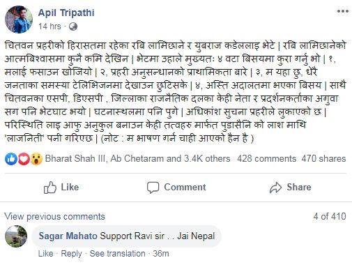“चितवन प्रहरीको हिरासतमा रहेका रबि लामिछाने र युबराज कडेललाइ भेटें | रबि लामिछानेको आत्मबिश्वासमा कुनै कमि देखिन | भेटमा उहाले मुख्यतः ४ वटा बिसयमा कुरा गर्नु भो | १, मलाई फसाउन खोजियो | २, प्रहरी अनुसन्धानको प्राथामिकता बारे | ३, म यहा छु, धेरै जनताका समस्या टेलिभिजनमा देखाउन छुटिसके | ४, अस्ति अदालतमा भएका बिसय | साथै चितवनका एसपी, डिएसपी , जिल्लाका राजनैतिक दलका केही नेता र प्रदर्शनकर्ताका अगुवा सग पनि भेटघाट भयो | घटनास्थलमा पनि पुगे | अधिकांश सुचना प्रहरीले लुकाएको छ | परिस्थिति लाइ आफु अनुकुल बनाउन केही तत्वहरु मार्फत पुडासैनि को लाश माथि ‘लाजनिती’ पनी गरिएछ | (नोट : म भाषण गर्न चाही आएको हैन है)”