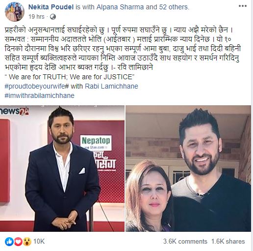” प्रहरीको अनुसन्धानलाई सघाईरहेको छु । पूर्ण रुपमा सघाउँने छु । न्याय अझै मरेको छैन । सम्भवत : सम्माननीय अदालतले भोलि (आईतबार ) मलाई प्रारम्भिक न्याय दिनेछ । यो १० दिनको दौरानमा विश्व भरि छरिएर रहनु भएका सम्पूर्ण आमा बुबा, दाजु भाई तथा दिदी बहिनी सहित सम्पूर्ण ब्यक्तित्वहरुले न्यायका निम्ति आवाज उठाउँदै साथ सहयोग र समर्थन गरिदिनु भएकोमा हृदय देखि आभार ब्यक्त गर्दछु ।- रवि लामिछाने