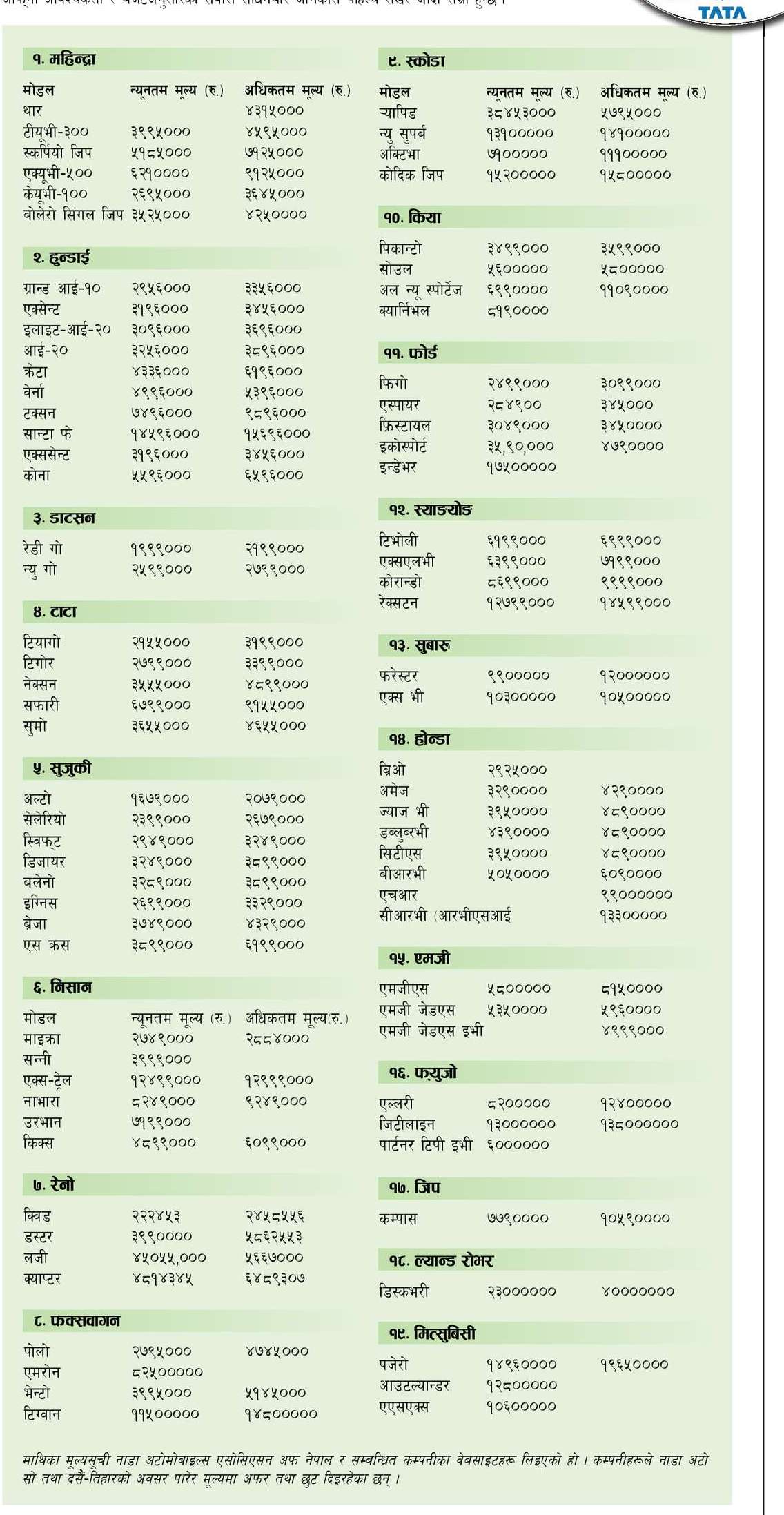 हाल कुन गाडीको मूल्य कति पर्छ भन्नेबारेको सूची आजको कान्तिपुर दैनिकमा उल्लेख गरिएको छ ।