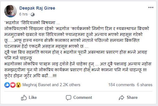 यसैबिच निर्माता तथा कलाकार दिपकराज गिरीले सामाजिक सञ्जालमार्फत् आफ्नो विचार राख्दै लोकप्रियताको शिखरमा रहेको “भद्रगोल “कार्यक्रमको निर्माण टिम र ब्यबस्थापन बिचको मनमुटाबको खबरले यस सिरियलको फ्यानहरूमा ठूलो अन्याय भएको महसूस गरेको बताउनुभएको छ । आफू हाँस्य ब्यग्य क्षेत्रकै कलाकार भएको नाताले पछिल्लो समयमा बिकसित घटनाक्रम हेर्दा एकदमै असहज महसूस भएको उहाँको धारणा छ ।