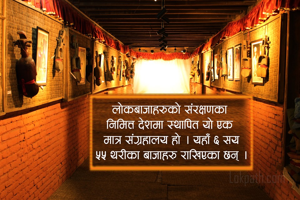प्रेरणा तिमल्सिना / काठमाडौं धेरैलाई थाहा नहुनसक्छ तर, काठमाडौंको त्रिपुरेश्वरमा हाम्रा मौलिक वाध्यवाजनहरुको संग्रहालय छ । राष्ट्रिय लोक बाजा संग्रहालय नामक यस संग्रहालयमा पूर्व मेचीदेखि पश्चिम महाकालीसम्म प्रयोग गरिने जातीय, धार्मिक, ऐतिहासिक महत्वका विभिन्न लोक बाजाहरु सजाइएका छन् । बाजाहरुलाई सिलसिलावद्धरुपमा भूगोलका आधारमा राखिएको छ । चम्किला बत्तीहरुको प्रयोगले संग्रहालयको वातावरण झनै मनमोहक बनाएको छ । संग्रहालय आफै पनि सांस्कृतिक शैलीमा निर्माण भएकाले झ्यालढोका र टुँडालमा कुँदिएका बुट्टाहरुले सुनमा सुगन्ध थपेका छन् ।