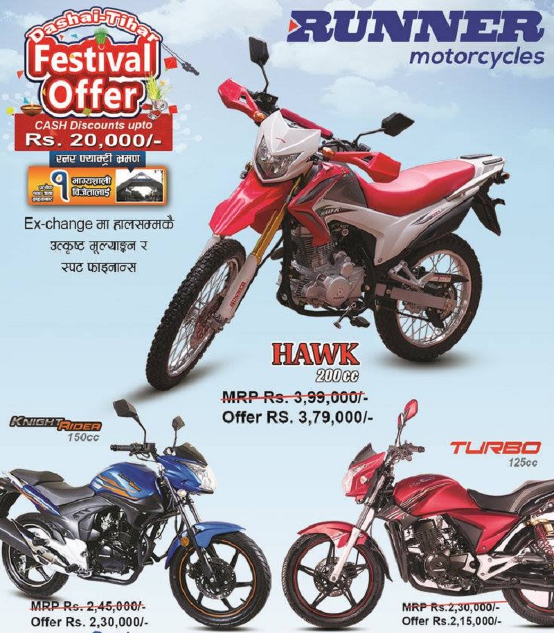 काठमाडौं । बंगलादेशको एक प्रतिष्ठित ब्राण्ड रनर मोटरसाइकलले दशैं , तिहार तथा छठको अवसरमा विशेष अफर ल्याएको छ । उक्त योजना अन्तर्गत रनर मोटरसाइलको खरिदमा नगद २० हजारसम्म छुटको व्यबस्था गरेको छ ।