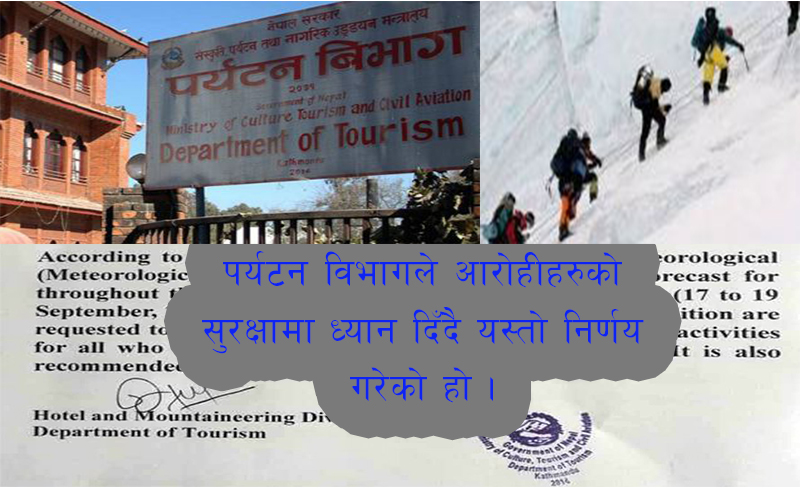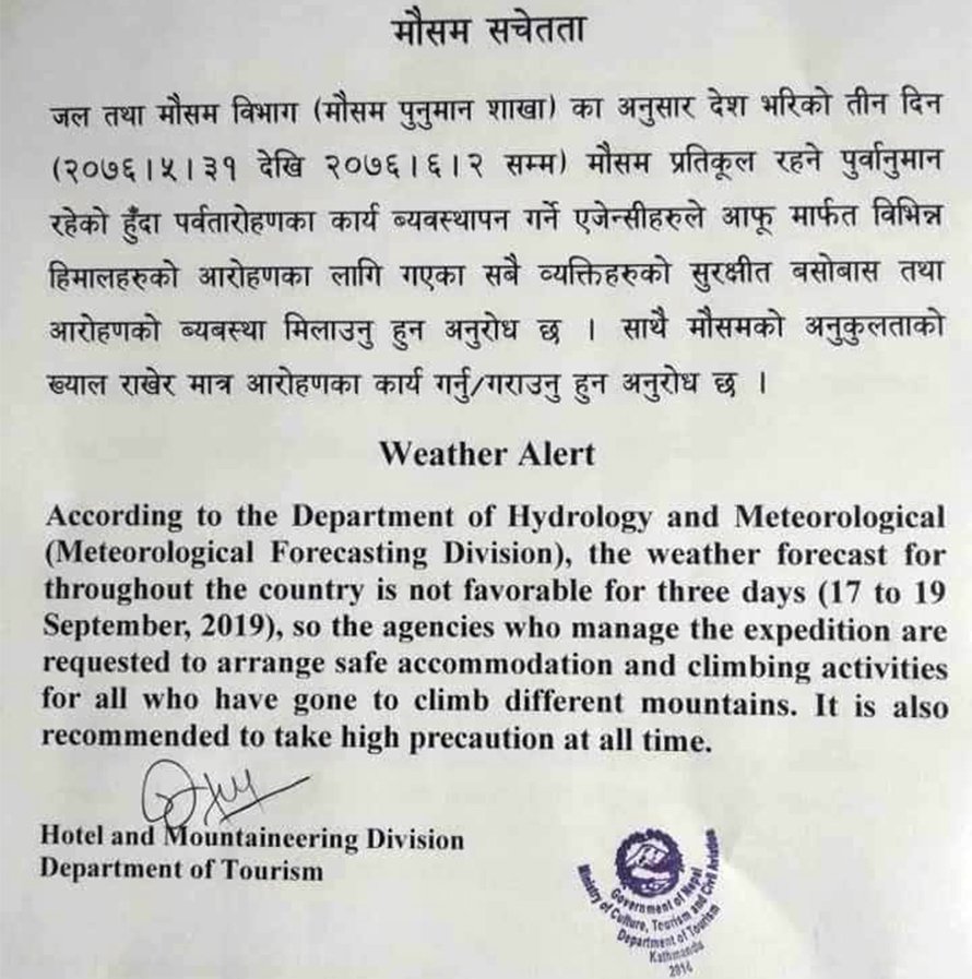 पर्यटन विभागले एक सचेतता सूचना जारी गर्दै आरोहीहरूको सुरक्षामा ध्यान दिन आग्रह गर्दै गर्दै निर्देशन दिएको छ । आरोहीहरूको सुरक्षामा ध्यान दिन आग्रह गर्दै वर्षा रोकिएपछि मात्रै आरोहण गराउन पर्वतारोहण एजेन्सीहरूलाई विभागले आग्रह गरेको हो ।