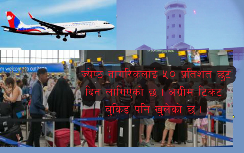 काठमाडौं । आज असोज १ गते । अर्थात् दशैं तिहार छठ जस्ता नेपालीहरुको महान् पर्व सुरु हुन लागेको छ । यसैबिच नेपाल एयरलाइन्सले ७० वर्ष कटेका ज्येष्ठ नागरिकलाई विमानको भाडामा ५० प्रतिशत छुट दिने घोषणा गरेको छ । यो भाडादर बुधबारबाटै लागू हुनेछ ।