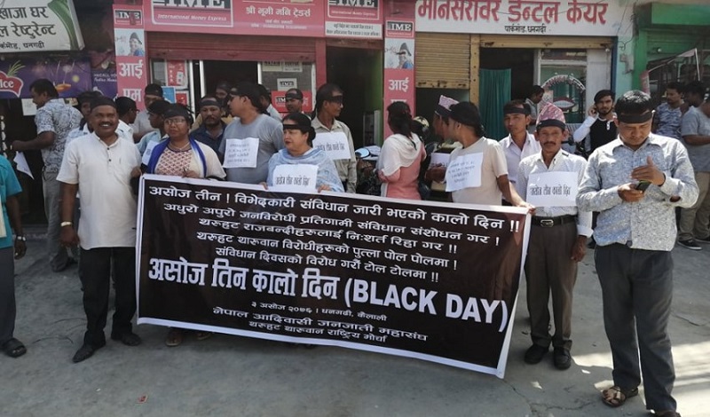 संविधान जारी भएको चौथो वर्ष असन्तुष्ट पक्षले ‘असोज तीन कालो दिन’ भन्दै संविधान नै जलाए । संविधान निर्माणकै क्रमबाट आन्दोलनमा होमिएका थरुहट पक्षधरले संविधानको धारा ३८, ४२, १८, ५६, र २७४ को अनुसूची ४ जलाएका थिए ।