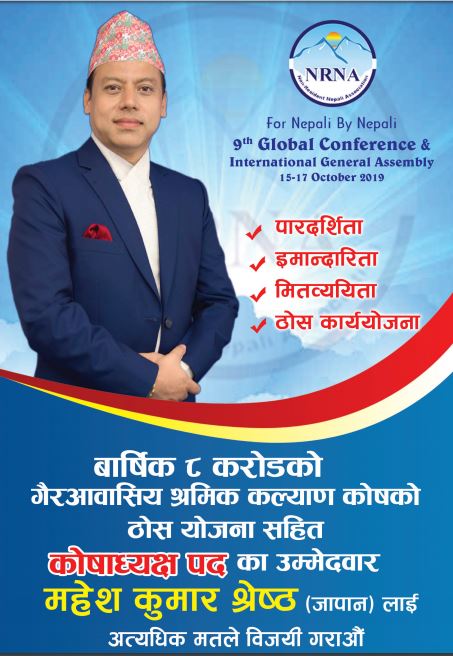 यसैक्रममा गैरआवासीय नेपाली सघं एनआरएनको कोषाअध्यक्ष पदमा महेश कुमार श्रेष्ठले उम्मेद्धारी दिनुभएको छ । गैरआवासीय नेपाली संघमा आर्थिक मितव्ययिता, पारदर्शिता एवं आर्थिक स्थायित्वको मुख्य एजेण्डा सहित नवौँ महाधिवेशनमा कोषाध्यक्ष पदमा उम्मेद्वारी दिने निर्णय गरेको पनि उहाँले प्रतिवद्दता व्यक्त गर्नुभएको छ ।