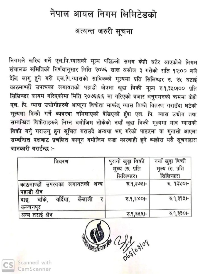 निगमले गत असोज ३ गते मध्यरातदेखि लागु हुने गरी एल.पी ग्याँसको मूल्य घटाएको थियो । खुद्रा मूल्यमा प्रति सिलिण्डर १३७५ रुपैयाँ रहेको मूल्यमा २५ रुपैयाँ घटाएको थियो ।