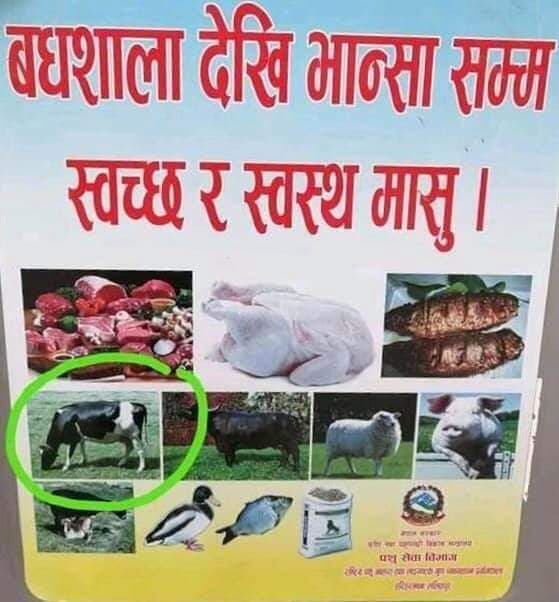 पोस्टरमा मासुजन्य पदार्थको रुपमा खसी, बंगुर, भेडा, माछासँगै गाईको तस्वीर राखिएको छ ।